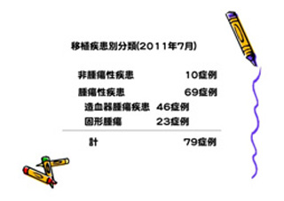 この間に造血幹細胞移植療法の対象となった患者さんは、一人で複数回の移植を受けている患者さんもあるので、総数で79名となっています。その疾患の内訳は、再生不良性貧血などの造血障害や免疫不全症といった非腫瘍性疾患が10名、白血病やリンパ腫などの造血器腫瘍が46名、神経芽腫をはじめとする固形腫瘍が23名となっています。
