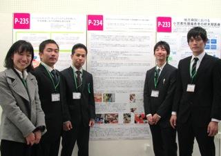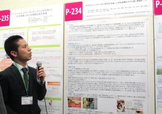 また、学生ボランティア・サークルのサニースマイルのメンバーが、「学生ボランティアによる入院児の支援〜小児科病棟の子ども達に笑顔を!〜」と題するポスター発表を行ないました。これは、病棟の面会時間終了から就寝までの時間を、子ども達がリラックスして過ごせるようにサポートを続けている活動を紹介したものです。メンバーのうち野口優輔君(5年生)、関谷竜彦君(4年生)、杉山知子さん(4年生)、飯尾一輝君(3年生)、上田健太郎君(3年生)の5名が学会に参加し、上田君が代表して活動紹介を行ないました。会場では、第9回日本小児がん看護学会も同時に開催されており、たくさんの医師や看護師が、このポスターを熱心に読んでいました。