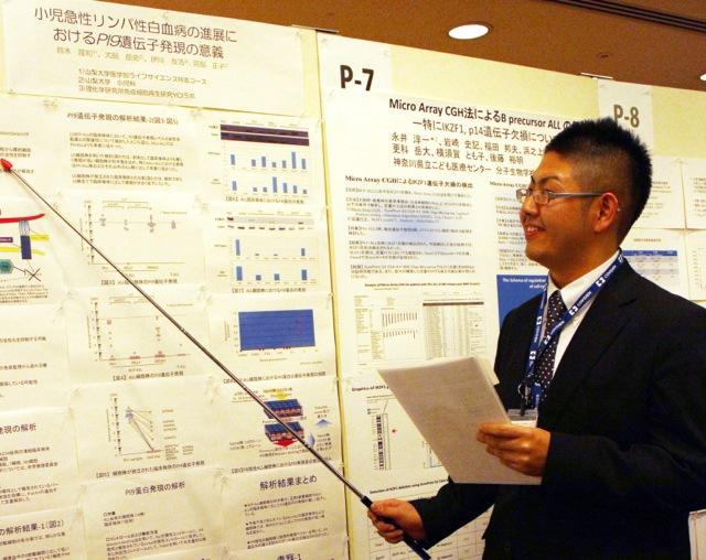2013年11月29日から12月1日に福岡で開催された、第55回日本小児血液がん学会学術集会において、当科のライフサイエンス特進コースで研究に取り組んでいる4年生の鈴木隆和君が、「小児急性リンパ性白血病の進展におけるPI9遺伝子発現の意義」と題してポスター発表を行いました。