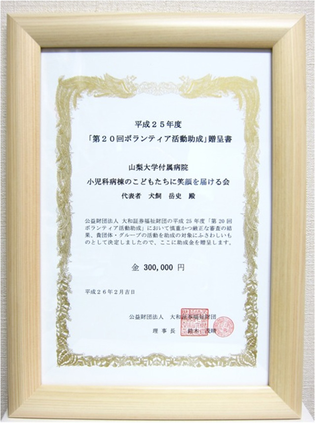 活動が認められて、平成26年度大和証券ボランティア基金の助成金を受賞しました。大雪の影響で授賞式は行われませんでしたが、証書が届きました。助成金を活用して、病棟の活動のさらなる充実に努めたいと思います。