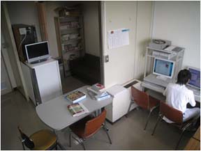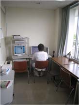 電子カルテ用のコンピューターはセキュリティーのために外部ネットワークにアクセスできないことから、別個に回線工事を行って外部ネットワークが利用可能なコンピューターを設置しました。電子カルテ用のコンピューターと並んで設置されており、臨床情報を参照しながらインターネットで文献検索もできるようになっています。机は一人で利用できるタイプとともに、数人で共用できる作業机も設置したため、指導医との意見交換などにも使えるようになっています。
