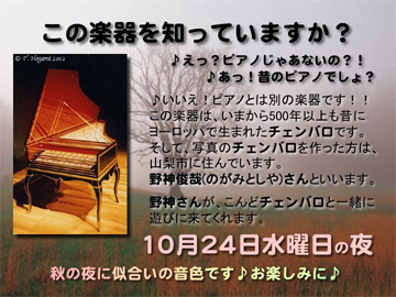 平成19年10月24日の夕方に、山梨市でチェンバロの工房をひらいている野神俊哉(のがみとしや)さんが、
