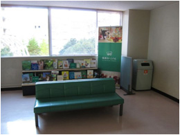 また、エレベーターホールでは、産科病棟や内視鏡検査室を訪れた患者さんや面会の人達もソファーに座って絵本を手に取っていたばかりでなく、