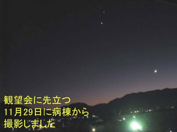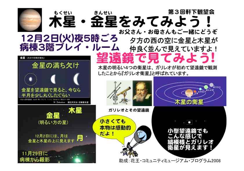 2008年12月2日に、第3回の小児科病棟「軒下観望会」として、夕方の西の空に仲良く並んで輝く金星と木星を観察しました。