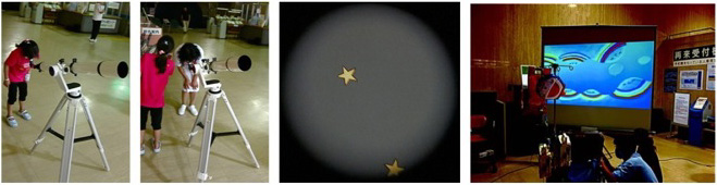 曇天で本物の夜空は見られませんでしたが、ホールの壁に貼られた星を望遠鏡でのぞいて、