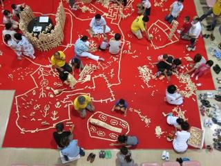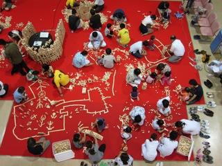 また、ウィルシステム・デザインの高尾徹さんが準備をして下さった投影機の周りをボランティアのスタッフがつみ木で飾り付けします。