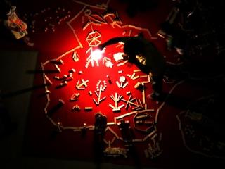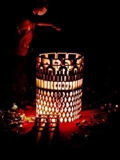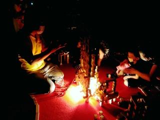 みんなの作品が仕上がったところで会場が暗くなると、作品のひとつひとつに「つみ木おじさん」が光を入れてくれます。光が入れられると、作品の大小にかかわらず、どの作品も美しく映えて、見つめるみんなの顔も満足感で輝きます。