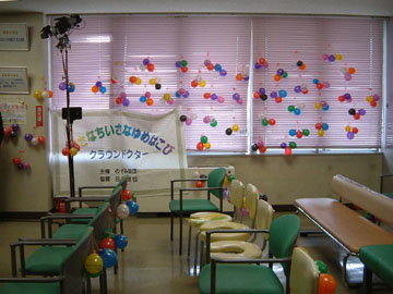 上演されたのは、NHKテレビにも出演した「人形劇団オフィスやまいも」による「あいさつのきらいな王さま」です。物語は、たくさんのあいさつにウンザリした王様が「あいさつを禁止する!」とおふれを出すことから始まり、劇団の人達と一体化した人形の迫力に、子供達はたちまち物語の世界へと引き込まれていきました。そして「あいさつ」を通じた人のつながりの大切さを感じた様子でした。舞台が仕立てられた病棟デイ・ルームは、数百個の色とりどりの風船も飾られてワクワクするような雰囲気に包まれていました。そして会が終わり、持ちきれないぐらいたくさんの風船をいただいて満面の笑みを浮かべる子供達の姿に、会の目的が十分に達せられたことを感じました。