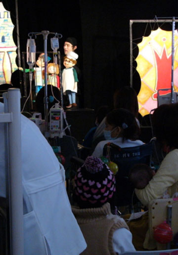 3月25日に人形劇の会が開かれました。この会は、長期入院している子供達に「治療や検査を乗り切るためのエネルギーを送りたい」という目的で、日本財団(船舶振興会)のサポートのもとに、「のぞみ財団」が行なう全国事業の一環として開催されたものです。