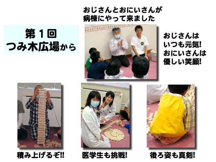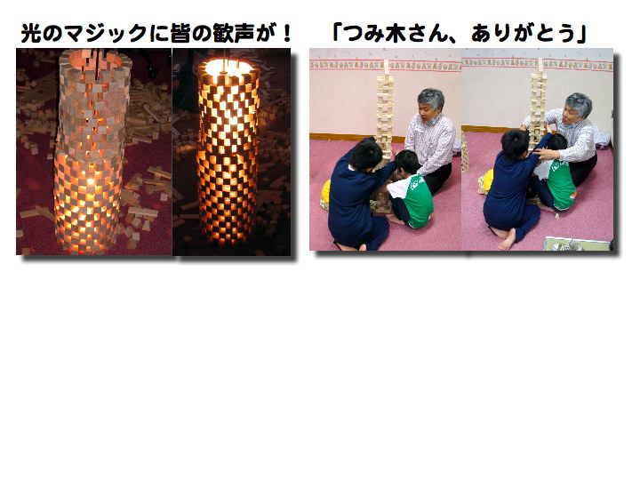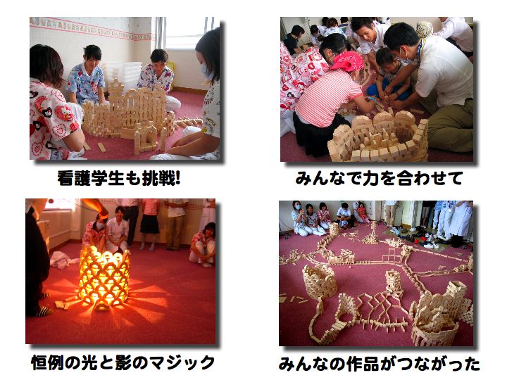 最初は作る意欲が湧かない子供達もいますが、荻野さん親子が子供達を心から褒めて下さるのと、周囲のお友達のがんばる姿に励まされて、途中で崩れてもあきらめずに皆が多様な作品を積み上げるようになります。大人には考えつかない豊かな発想と、その生き生きとした表情に、お母さん達も嬉しそうに子供達を見守っています。子供達だけでなく、お母さんや臨床・看護実習の学生さん、そして病棟スッタフも子供達と一緒になって積み木を楽しんでいます。出来上がった作品にライトを当てていただくと、作品が幻想的な光を放つだけでなく、影が生き物のように姿をかえていきます。その美しさには、毎回大きな歓声が上がります。