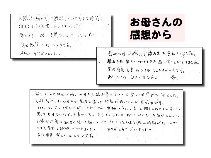 ヒノキの間伐材から作られた積み木は、ひとつひとつ丁寧に角が落とされていて、その軽さとぬくもり・香りそして乾いた音が心地よく感ぜられます。積み木は3種類で、精密に作られているため、無限のひろがりがあります。毎回5千個の積み木を持参していただき、プレイ・ルームで楽しんでいます。