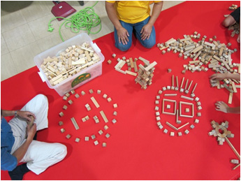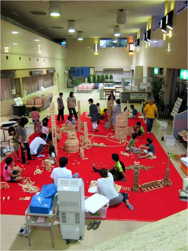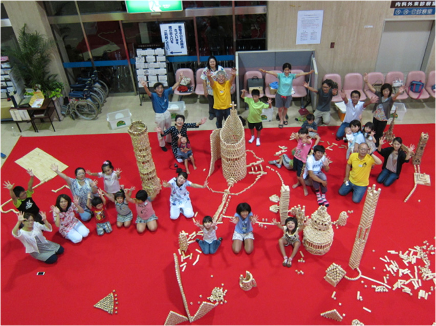 病棟では、市内の木楽舎つみ木研究所のスタッフが、毎月1回6,000 個の積み木を用いた「つみ木広場」を開催して下さっています。2008年の春から始まったこの活動が、2013年5月で50回目の節目を迎えました。そこで、入院中に積み木広場を楽しんで退院し、現在も外来に定期通院している子どもたちとその家族を対象にして、8月25日(日曜日)に外来ホールで50回記念の「つみ木広場」を開催しました。当日は、6家族21人が看護学科の学生ボランティアと一緒に10,000個の積み木で楽しみました。