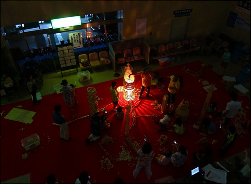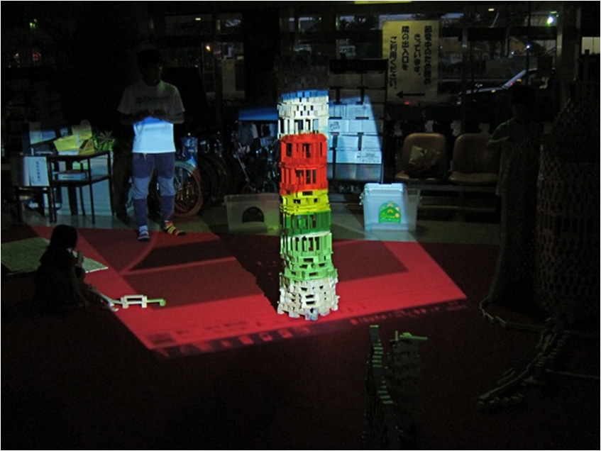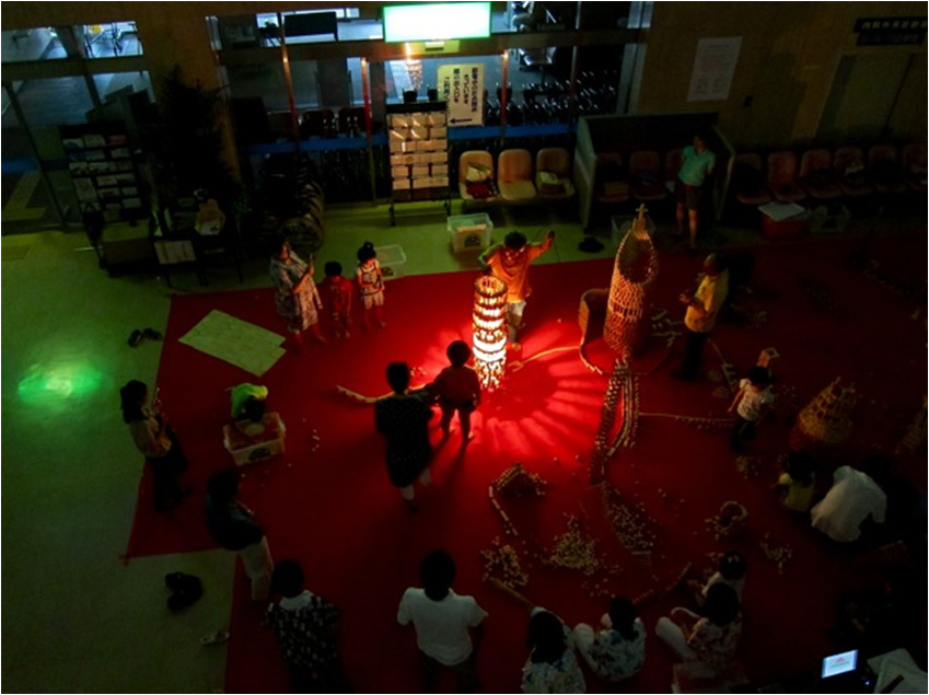 恒例の作品への明かり入れでは、今回はつみ木おじさんが新企画を用意してくれていました。自分たちの作品が虹色の光に照らされる様子に、子どもたちは大喜びでした。木楽舎つみ木研究所のスタッフのみなさんは、元気になって成長した子どもたちとの久しぶりの再会と、子どもたちの成長ぶりをとても喜んでいました。