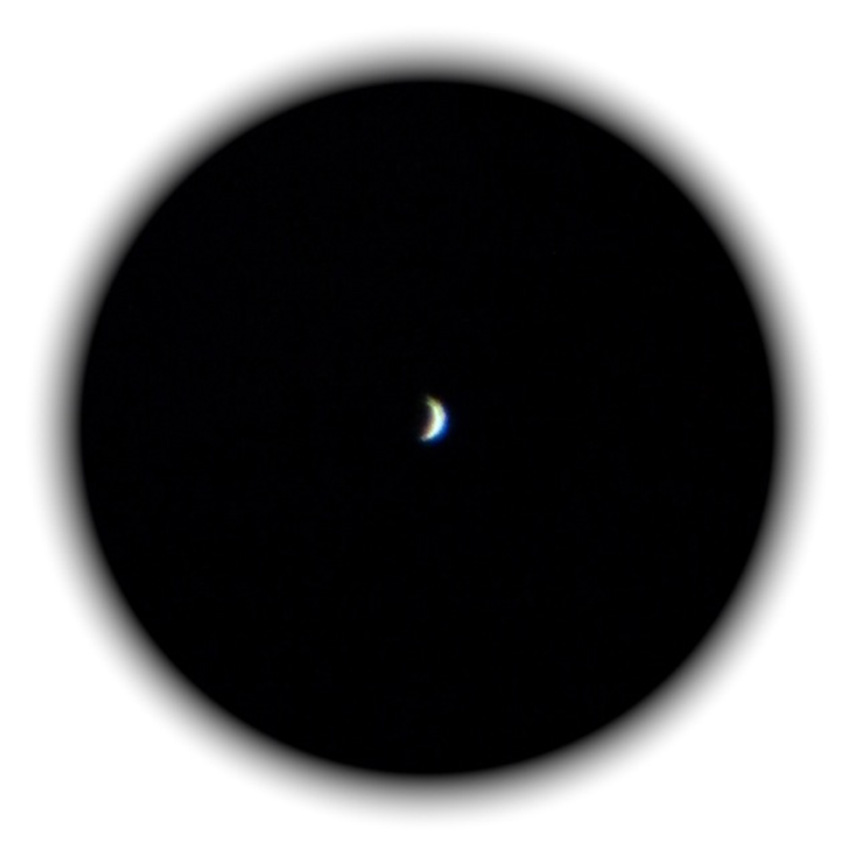 この夜は、三日月をもっと細くしたような姿を見ることができました。デジカメを望遠鏡の接眼部にくっつけて撮影したのが、こちらの写真ですが、実際に目で見たよりも少し「太って」写っています。