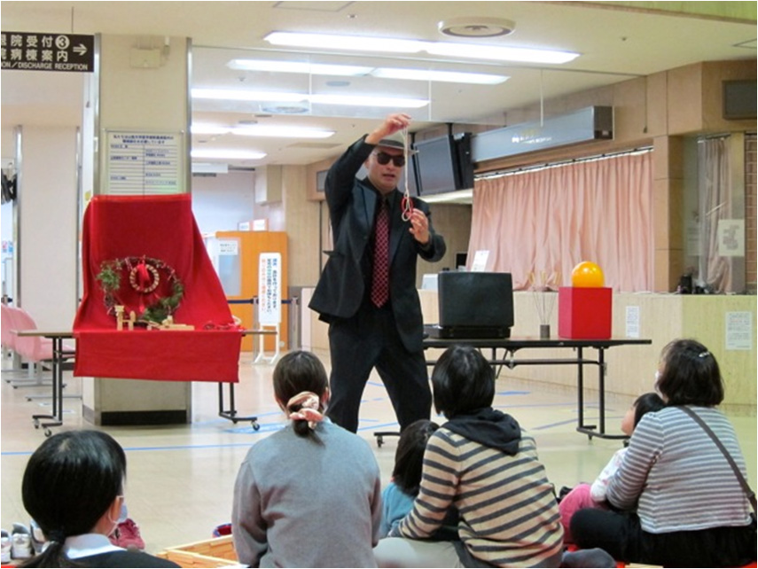 つみ木作品ができあがったところで、恒例のJunさんによるマジック・ショーです。今回は、ダンディーJunさんに扮してマジックが披露されました。カードに書いたスプーンが曲がってしまったり、割れたハズの風船がよみがえったりと、軽妙なおしゃべりを聞きながら楽しみました。ティッシュ・ペーパーを使ったマジックでは、みんなにネタを教えてくれましたが、教えてもらっても簡単には真似出来ません。ネタをバラしたのに、かえって尊敬されてしまうJunさん、流石です!!この後で、Junさんは会場に来られなかった子どもたちの病室でもマジックを見せて下さいました。