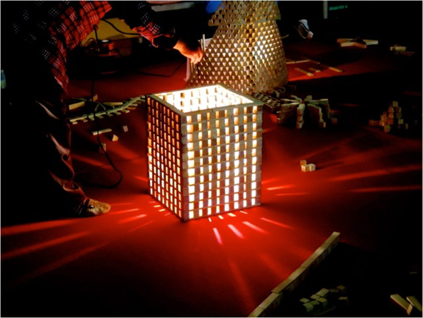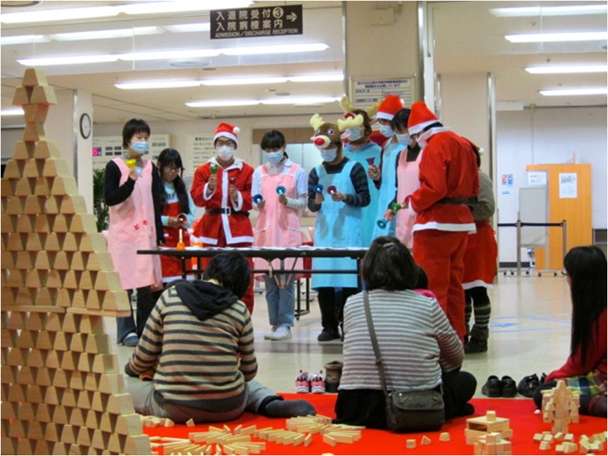 2013年の小児科病棟クリスマス会が12月17日に外来ホールで行われました。最初に、ホールに敷き詰められた赤いカーペットの上で、木楽舎つみ木研究所のみなさんと56回目のつみ木広場を兼ねて1万個のつみ木を使って遊びました。つみ木おにいさんが作った恒例のクリスマス・ツリーだけでなく、ケーキや雪の結晶などクリスマスらしい作品が作られました。また、素敵なリースも用意して下さり、みんなで願いを込めてリボンを結わい付けました。