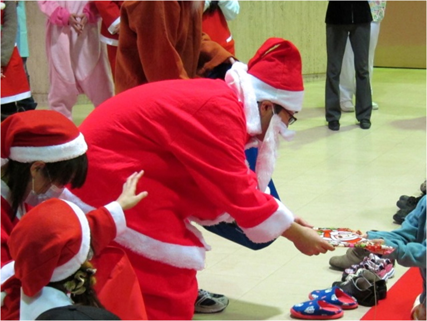会場の灯が消されると、つみ木おじさんが1つ1つの作品に光を入れてくれました。光と影の競演を楽しみ、ゆったりした気分になったところで、サンタクロースが登場してみんなにプレゼントが手渡されました。今年は、京都大学付属病院小児科病棟ボランティア・グループの「にこにこトマト」のみなさんを通じて、メイクアウィッシュから一人一人にクマのぬいぐるみもいただきました。スターバックスコーヒーからはジュースをいただきました。また、「山梨まんまクラブ」のみなさんからも病棟にプレゼントをいただき、代表の若尾さんからエールをいただきました。