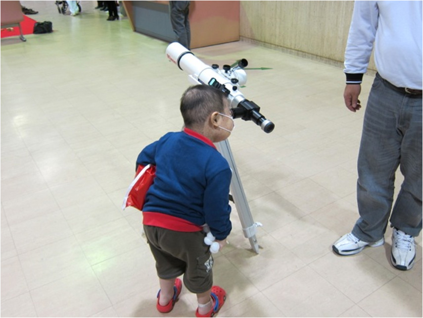 会場の外には、今年も星の語り部のメンバーのみなさんが望遠鏡を用意して下さいました。晴れていたら、満月や木星、金星を見てもらう予定だったのですが、雲に阻まれてしまいました。そこでホールに望遠鏡が設置されました。